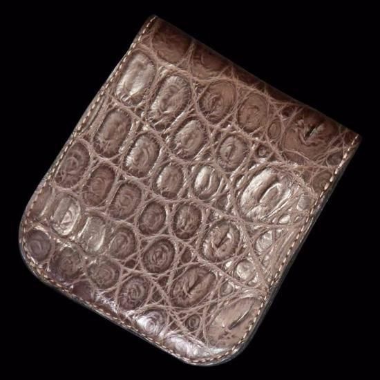 最高級の大型のクロコダイルのサイド部分で制作しました。コブが少し入る所もクロコダイルを堪能出来ます。非常にワイルドで高級感のある仕上がりです。色はレアなチャコールです。